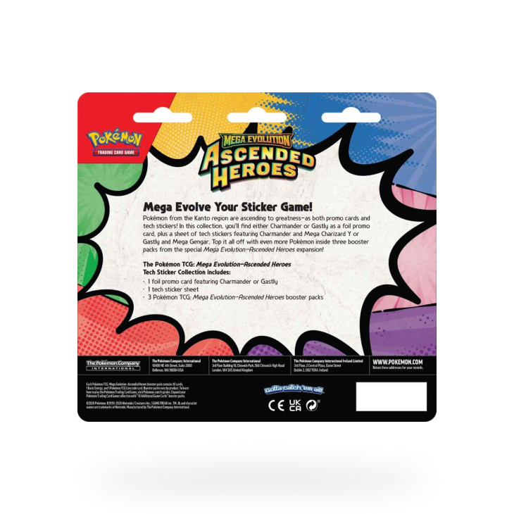 Pokémon Ascended Heroes Tech Sticker Collection obsahuje 3 booster balíčky ze série Ascended Heroes (Mega Charizard / Mega Gengar), samolepku a promo kartu (Charmander / Gastly).