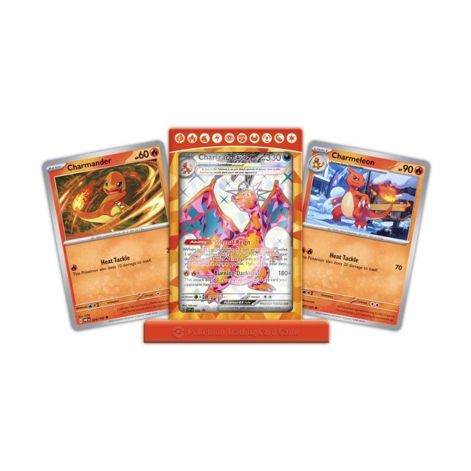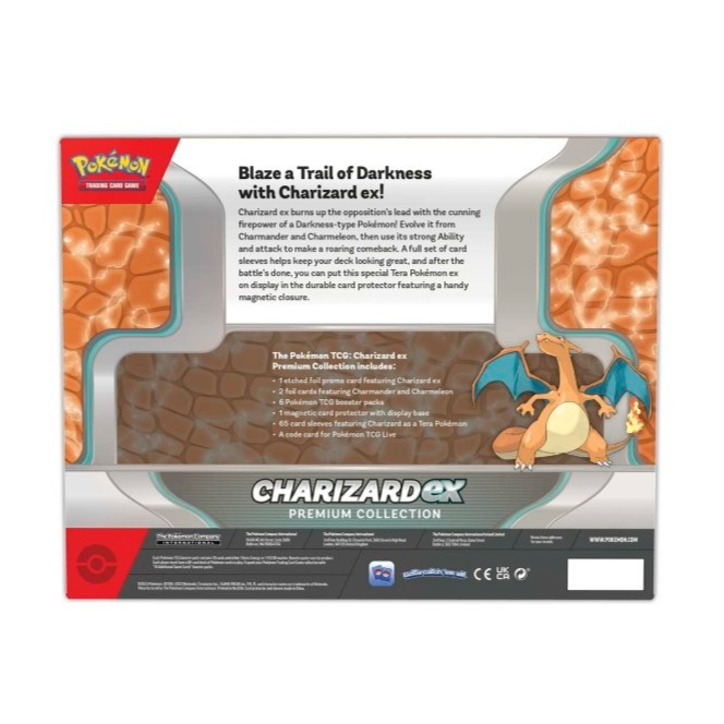 Pokémon Charizard ex Premium Collection Box je tu! Po dlouhé době jsme se opět dočkali oblíbeného a nelítosného Charizarda v samostatném boxu. Prémiový box s vývinem Charizarda obsahuje kromě jeho karet i 6 booster balíčků (2x Scarlet and Violet, 2x Paldea Evolved a 2x Obsidian Flames), obaly na karty a navíc i magnetický obal na kartu se stojánkem určený k vystavení vaší nejoblíbenější karty.