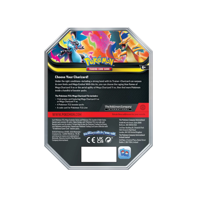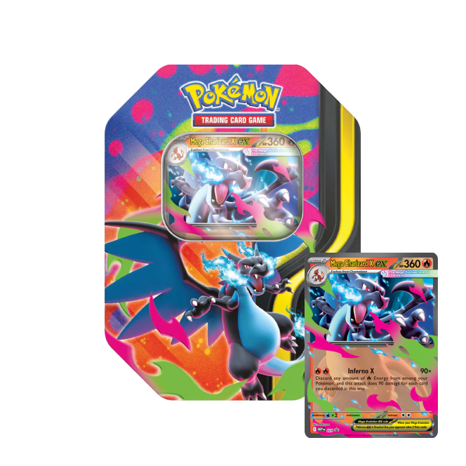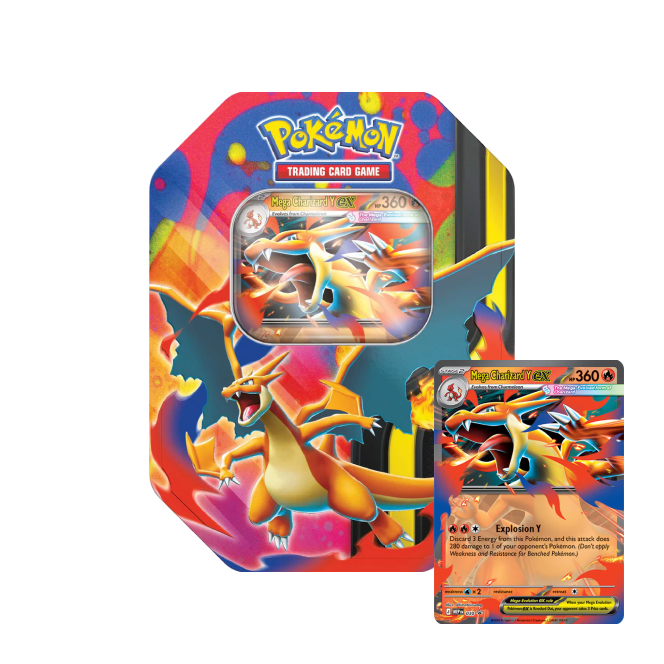 Pokémon plechovka Mega Charizard ex Tin je speciální produkt karetní hry Pokémon TCG v podobě krásné plechové krabičky s motivem Pokémonů Mega Charizard X ex a Mega Charizard Y ex , jejichž promo kartu kromě 4 booster balíčků také obsahuje. Plechovka je ideálním, cenově dostupným dárkem pro každého trenéra Pokémonů.