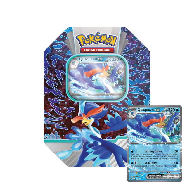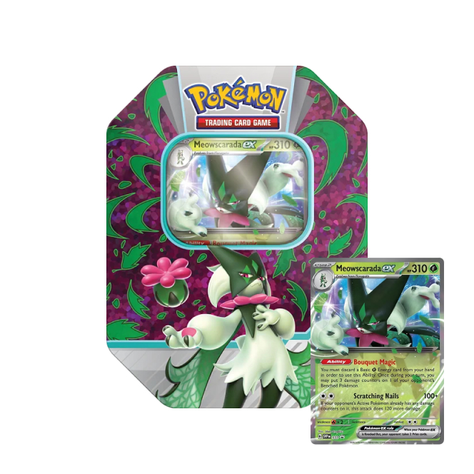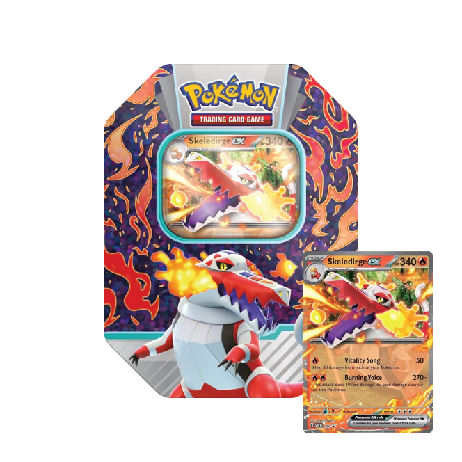 Pokémon plechovka Paldea Partners ex Tin je speciální produkt karetní hry Pokémon TCG v podobě krásné plechové krabičky s motivem Pokémonů Skeledirge ex, Meowscarada ex a Quaquaval ex, jejichž promo kartu kromě 4 booster balíčků také obsahuje. Plechovka je ideálním, cenově dostupným dárkem pro každého trenéra Pokémonů.