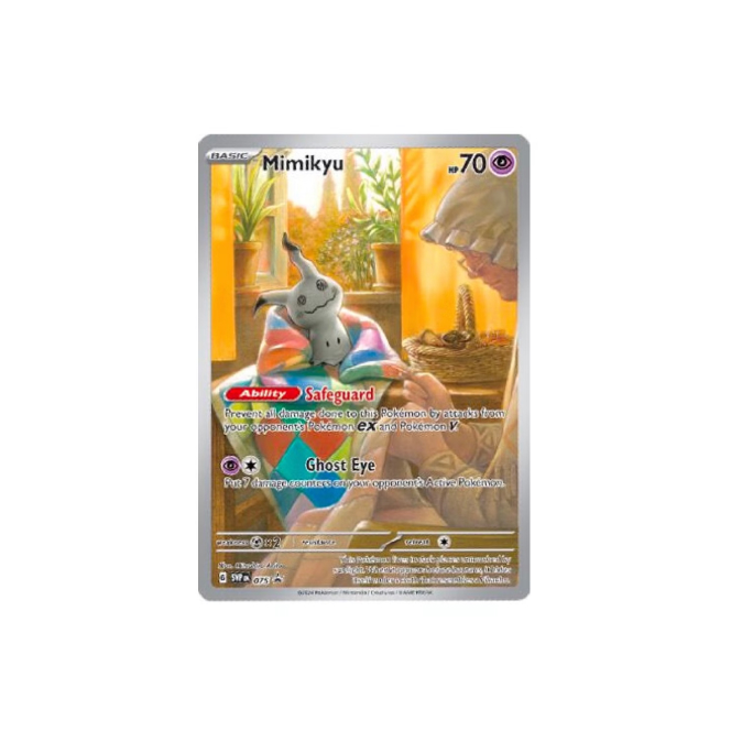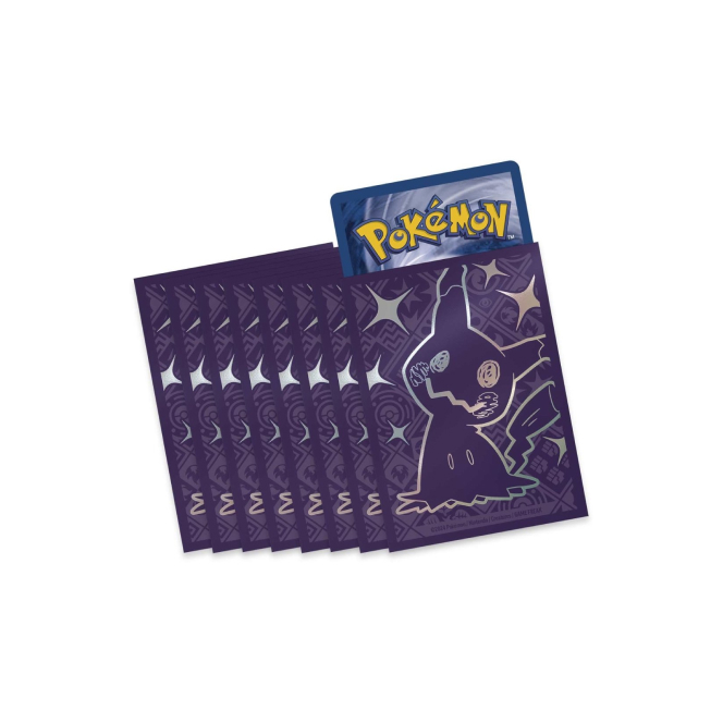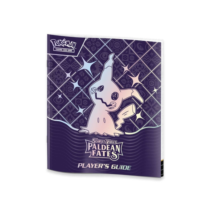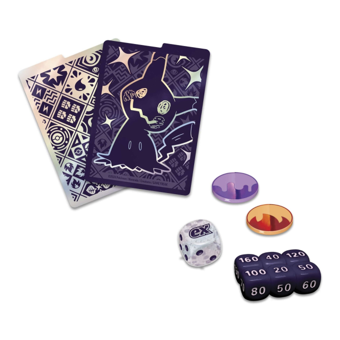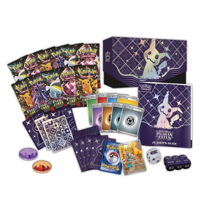 V Elite Trainer Boxu Paldean Fates naleznete kromě 9 balíčků Pokémon karet i full-artovou kartu Shiny Mimikyu, 65 ks stylových obalů na karty, 45 Energy karet, 4 oddělovače na karty, průvodce hrou, 6 kostek, minci, 2 markery. To vše je zabalené v pevné krabici, kterou využijete na uskladnění karet nebo jiných drobností. Vše je sladěné v designu Shiny Mimikyu.