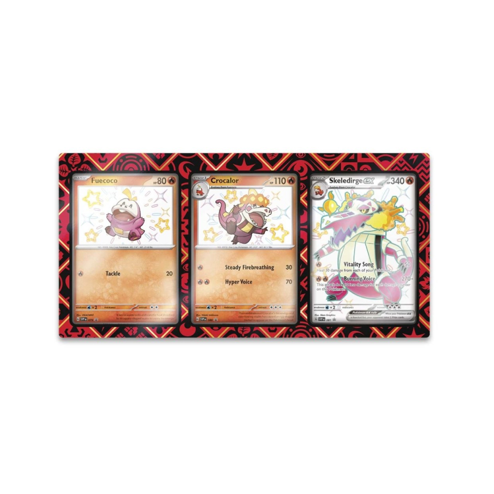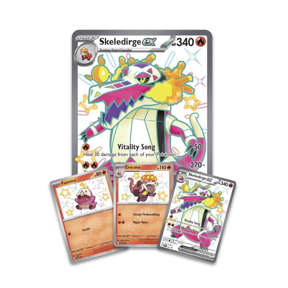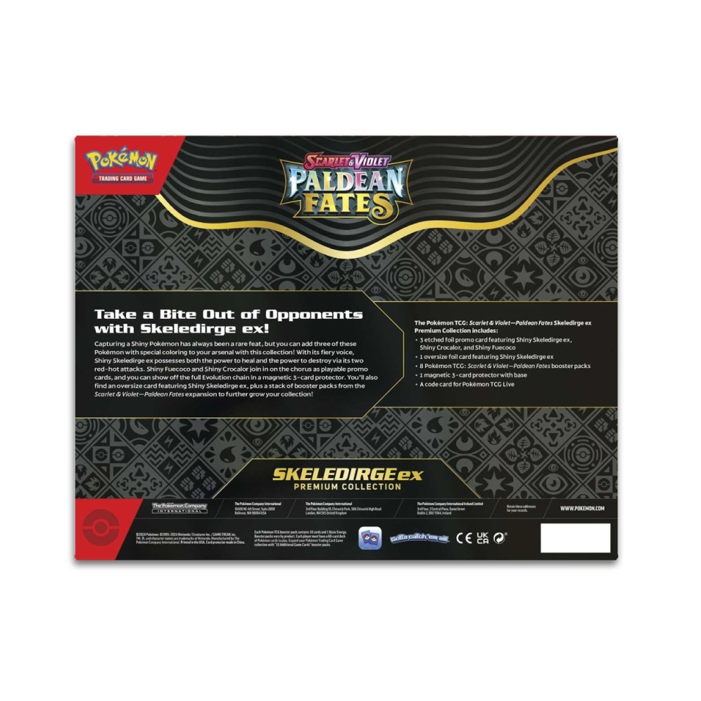 Pokémon Paldean Fates Premium Collection Skeledirge ex je balení 8 boosterů, tří promo karet, jedné jumbo karty a magnetického stojánku na tři karty. Jedná se o typ balení, který tu ještě nebyl, zároveň nabízí výborný poměr cena/výkon!