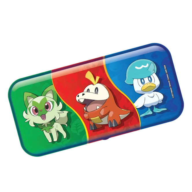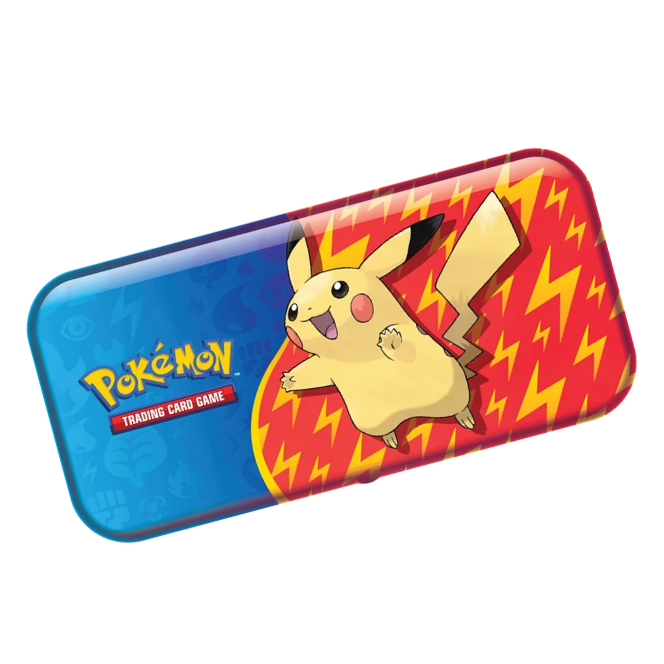 Plechový penál na tužky Pokémon Back to School Pencil Tin 2023. Plechová krabička s motivem oblíbeného bleskového Pokémona Pikachu a startovních Pokémonů ze Scarlet and Violet série pomůže udržet pořádek v tužkách a pastelkách každému trenérovi Pokémonů. Navíc pplechovka obsahuje 2 booster balíčky karet karetní hry Pokémon TCG, které vám pomohou rozšířit vaši sbírku.