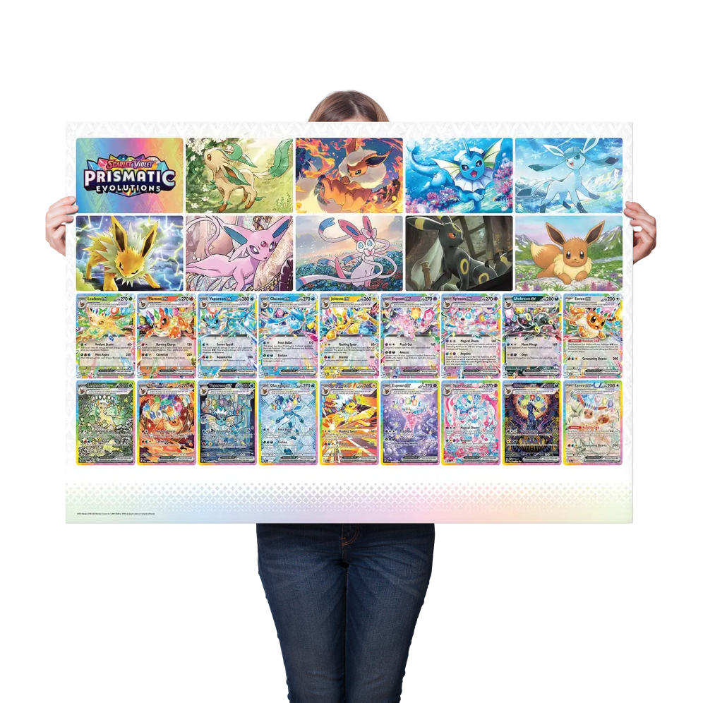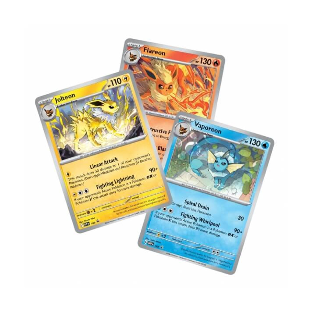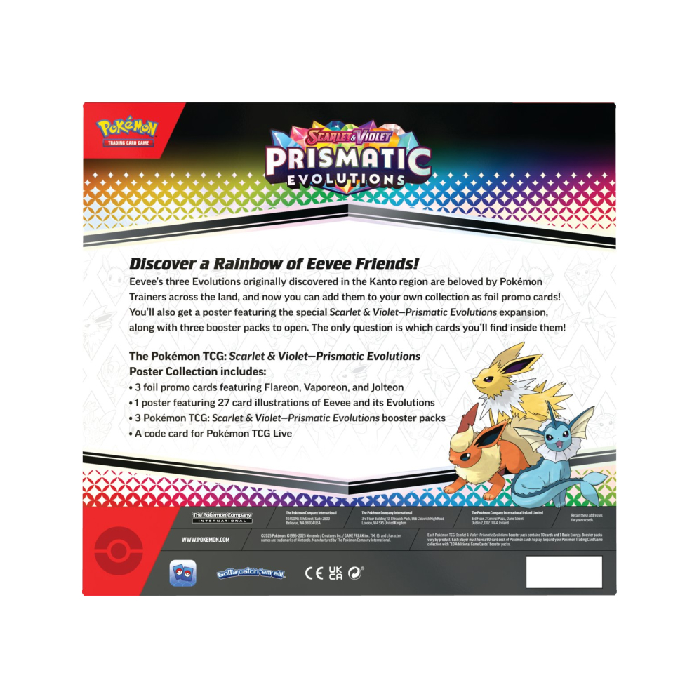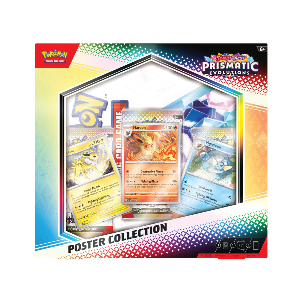 Toto unikátní balení obsahuje oboustranný plakát, který dokonale doplní výzdobu pokoje každého trenéra Pokémonů. Součástí balení jsou rovněž 3 booster balíčky Pokémon Prismatic Evolutions a 3 exkluzivní foilové promo karty s oblíbenými Pokémony Flareon, Vaporeon a Jolteon.