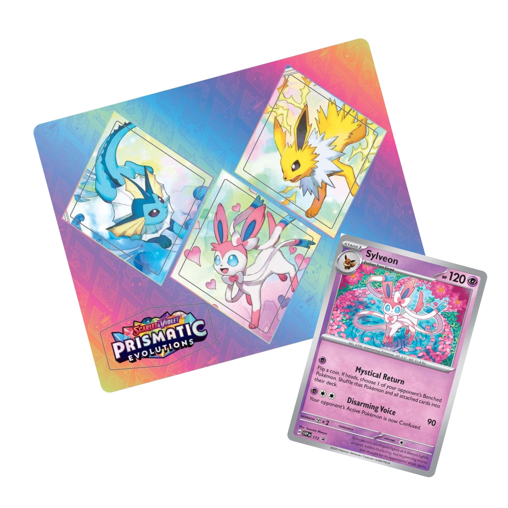 Speciální balení ve 3 variantách: se zeleným Leafeonem, ledovým Glaceonem nebo roztomilým Sylveonem (toto balení) a jejich exkluzivní foilovou promo kartou! Součástí každého balení jsou rovněž 3 booster balíčky Pokémon Prismatic Evolutions a speciální odolné samolepky, kterými si můžete vyzdobit svůj počítač, tablet, telefon nebo cokoliv, co vás napadne. Zkompletujte svou sbírku všemi třemi variantami!