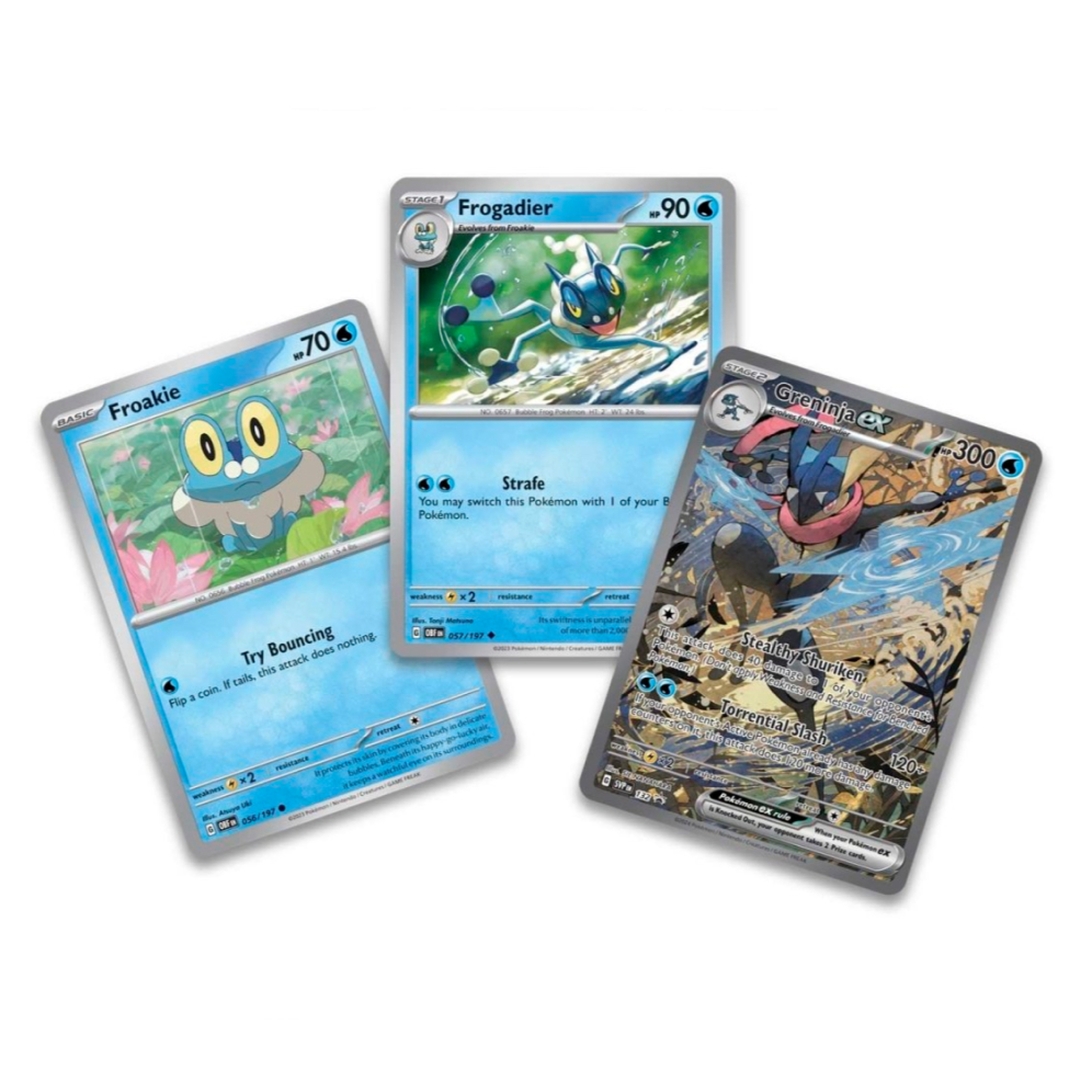 V balení naleznete kromě hratelné silné Pokémon karty Greninja ex i další dvě foilové promo karty Froakie a Frogadier, 5 booster balíčků Pokémon a kód do hry Pokémon TCG Live.