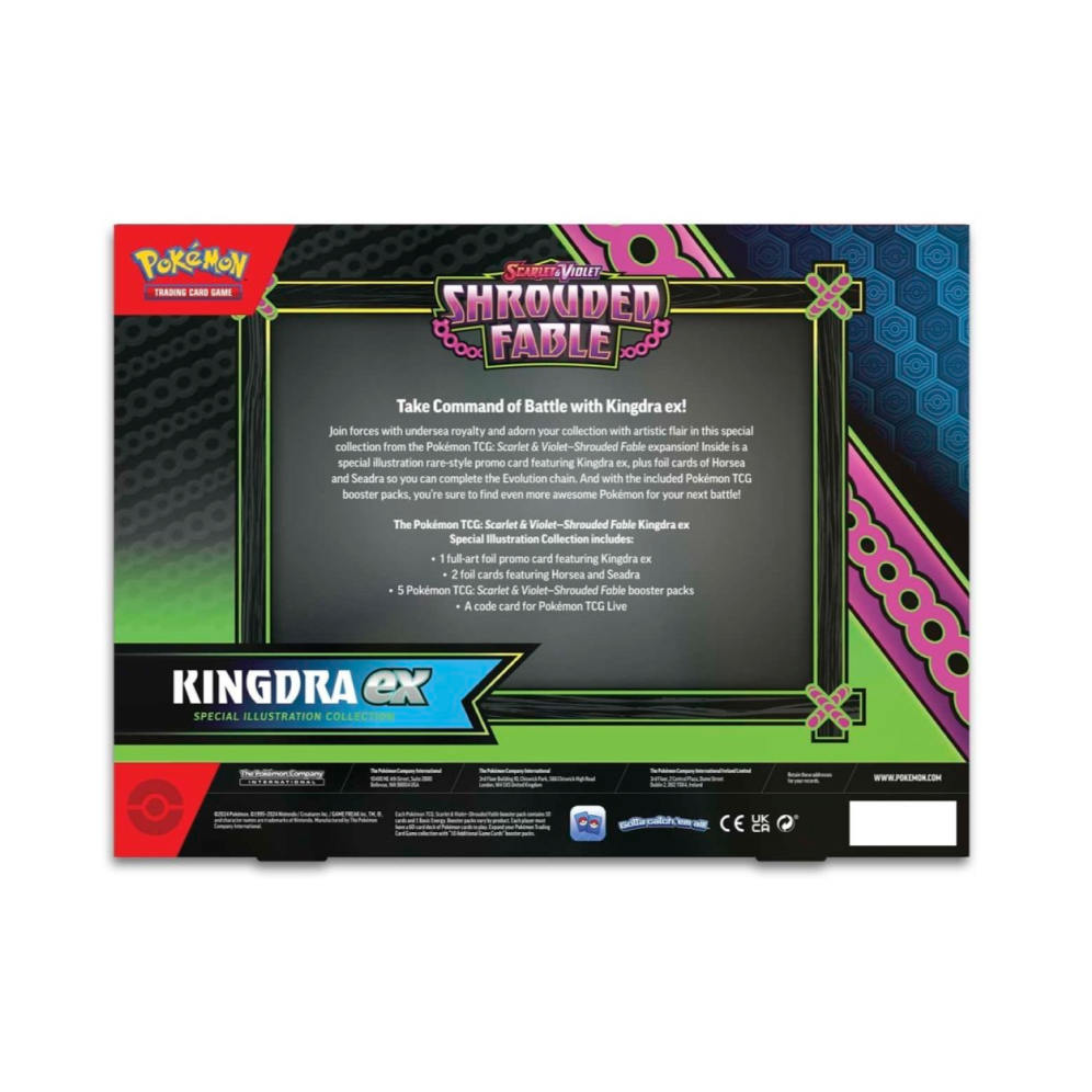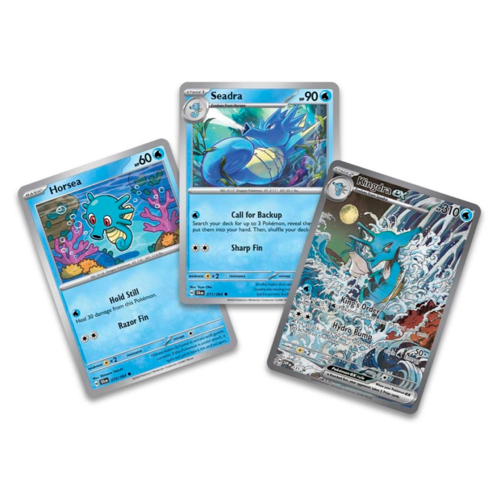 V balení naleznete kromě hratelné silné Pokémon karty Kingdra ex i další dvě foilové promo karty Horsea a Seadra, 5 booster balíčků Pokémon a kód do hry Pokémon TCG Live.