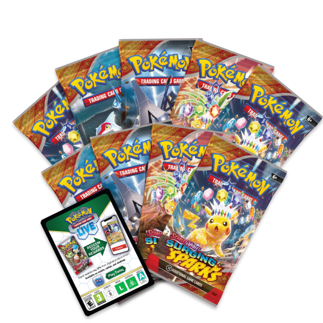 Pokémon Surging Sparks Elite Trainer Box je prémiové balení 9 boosterů edice Surging Sparks a mnoha dalších drobností. Elite Trainer Box je balení určené všem fanouškům Pokémon karet - jak sběratelům, tak hráčům.