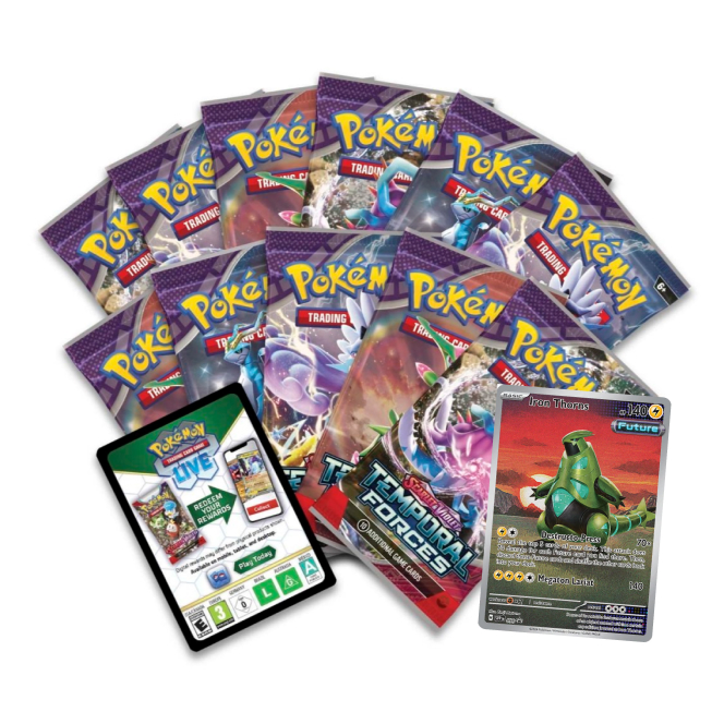 V edici Temporal Forces se řady prastarých a budoucích pokémonů stále rozrůstají! Walking Wake ex se spolu s Raging Bolt ex osvobozuje od minulosti, zatímco Iron Leaves ex s Iron Crown ex přináší spravedlnost z budoucnosti.